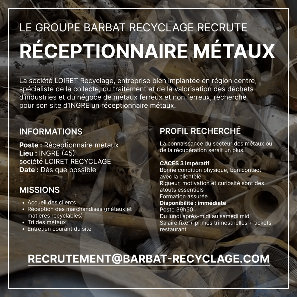 Le Groupe Barbat Recyclage RECRUTE un réceptionnaire métaux à INGRE (45)